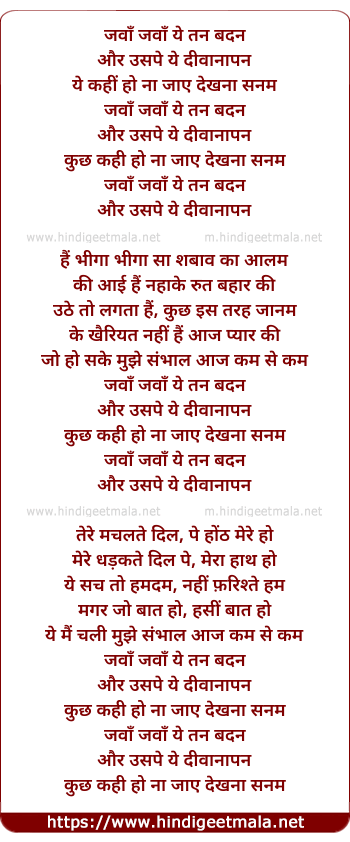 Lyrics of Jawan Jawan Yeh Tan Badan - जवाँ जवाँ ये तन बदन