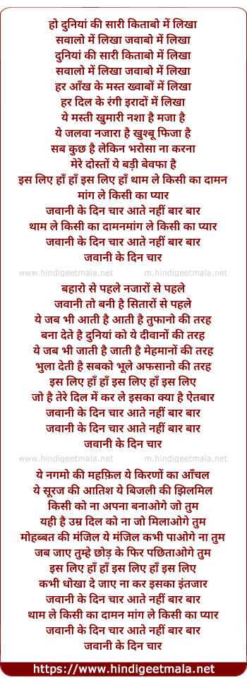 Lyrics of Jawani Ke Din Chaar - हो दुनियां की सारी किताबो में लिखा