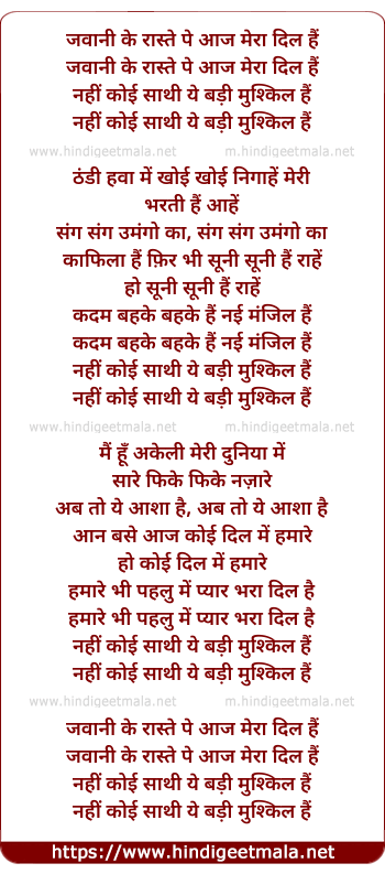 Lyrics of Jawani Ke Raaste Pe Aaj Mera Dil Hai - जवानी के रास्ते पे आज मेरा दिल हैं