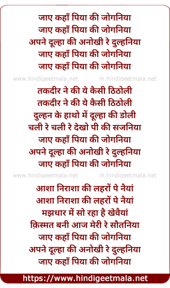 Lyrics of Jaye Kahan Piyaa Ki Joganiyan - जाए कहाँ पिया की जोगनिया
