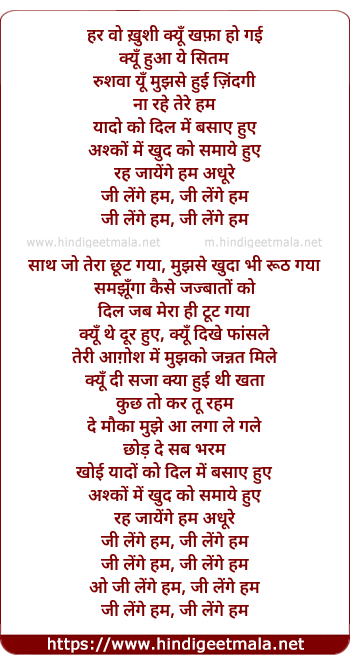 Lyrics of Jee Lenge Hum - हर वो ख़ुशी क्यूँ खफ़ा हो गई