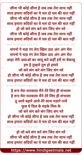 Lyrics of Jina Bhi Koi Jina Hai, Jab Tak Tera Saath Nahi - जीना भी कोई जीना है, जब तक तेरा साथ नहीं