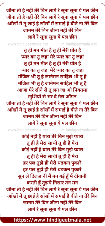 Lyrics of Jeena To Hai Nahi Tere Bin - जीना तो है नहीं तेरे बिन
