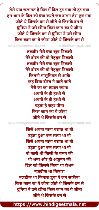 teri yaad salaamat hai dil mein dil toot gaya to toot gaya