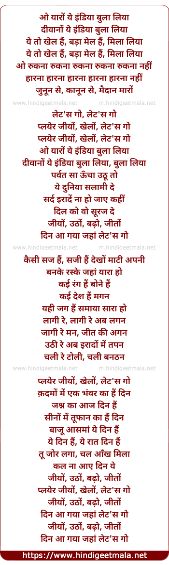 Lyrics of Jeeyo Utho Badho Jeeto - ओ यारों ये इंडिया बुला लिया
