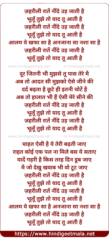 Lyrics of Jehrilee Rate Ninde Udd Jatee Hain - ज़हरीली रातें नींदे उड़ जाती है