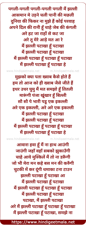 Lyrics of Jhalli Patakha - पगली-पगली पगली-पगली पगली मैं झल्ली