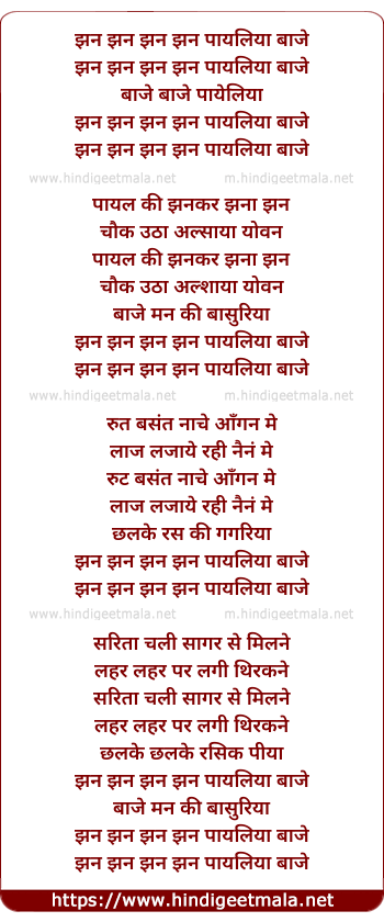 Lyrics of Jhan Jhan Payaliya Baje - झन झन झन झन पायलिया बाजे