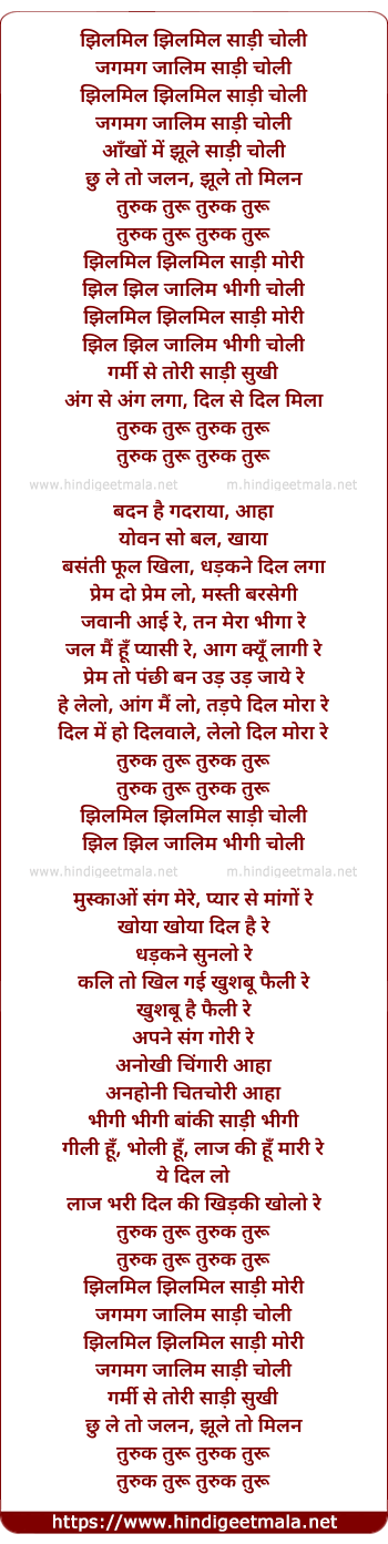 Lyrics of Jhilmil Saari Choli - झिलमिल साड़ी चोली