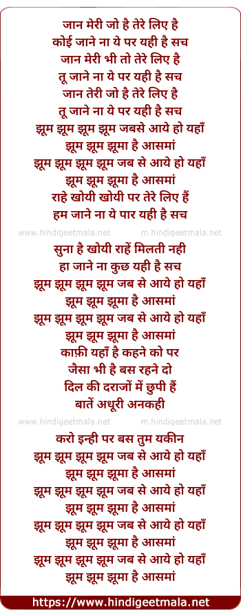 Lyrics of Jhoom Jhoom Jhuma Hai Aasmaan - झूम झूम झूमा है आसमान