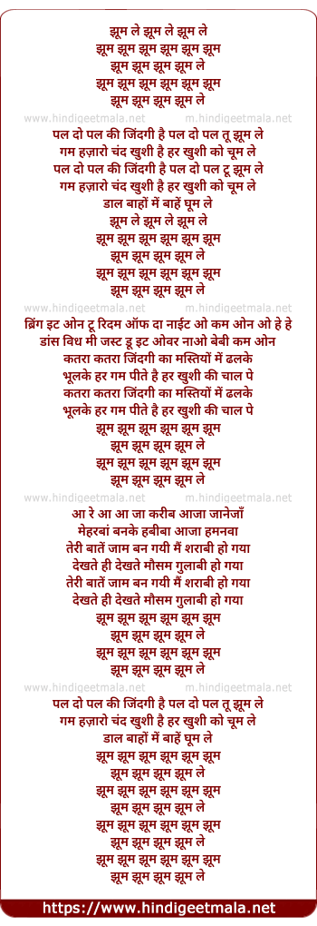 Lyrics of Jhoom Le Jhoom Le Jhoom Le - झूम ले झूम ले झूम ले