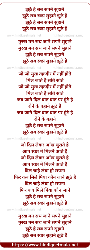 Lyrics of Jhuthe Hain Sab Sapne Suhane - झूठे है सब सपने सुहाने