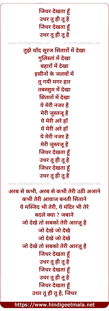 Lyrics of Jidhar Dekhta Hu Udhar Tu Hi Tu - जिधर देखता हूँ