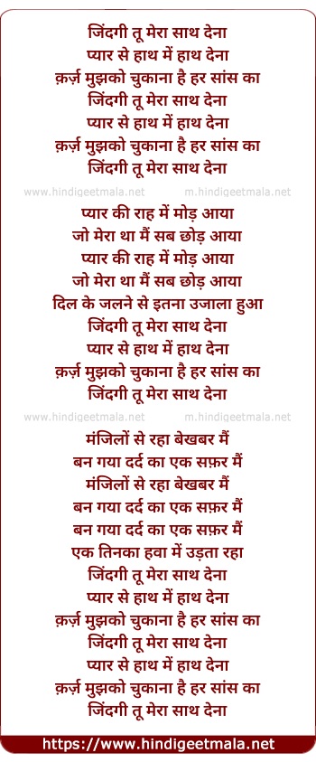 Lyrics of Jindagi Tu Meraa Sath Dena - जिंदगी तू मेरा साथ देना