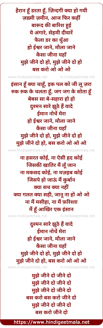 Lyrics of Jine Do - हैरान हूँ डरता हूँ, ज़िन्दगी क्या हो गयी