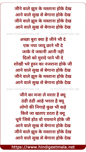 Lyrics of Jine Wale Jhum Ke Mastana Ho Ke Dekh - जीने वाले झूम के मस्ताना होके देख