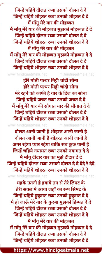 Lyrics of Jinhe Chahiye Daulat Rabba Unko Daulat De De - जिन्हें चाहिये दौलत रब्बा उसको दौलत दे दे