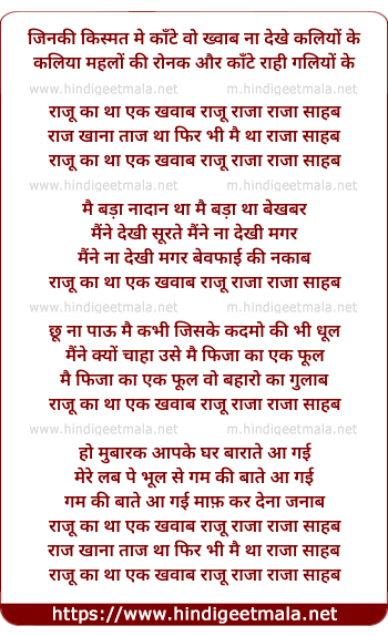 Film CastShobhraj, Shashi Kapoor, Nanda, Rajendra Nath, Naaz, Mirza Musharraf, Agha, Kamal Kapoor, Azra, ShammiSingerLata Mangeshkar, Mohammed Rafi, Suman KalyanpurLyricistAnand BakshiMusic ByKalayanji, AnandjiDirectorSuraj PrakashExternal LinksRaja Saab at IMDB Raja Saab at WikipediaYouTubeRaja Saab at YT Raja Saab at YT(2)