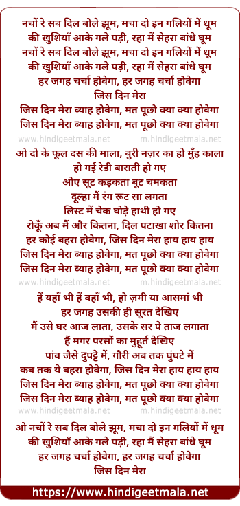 Lyrics of Jis Din (Remix) - नचों रे सब दिल बोले झूम, मचा दो इन गलियों में धूम
