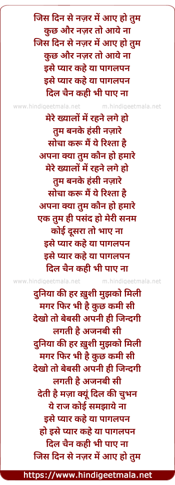 Lyrics of Jis Din Se Nazar - जिस दिन से नज़र में आए हो तुम
