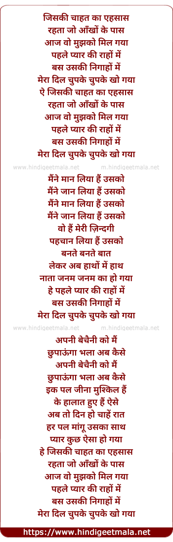 Lyrics of Jiski Chahat Kaa - जिसकी चाहत का एहसास