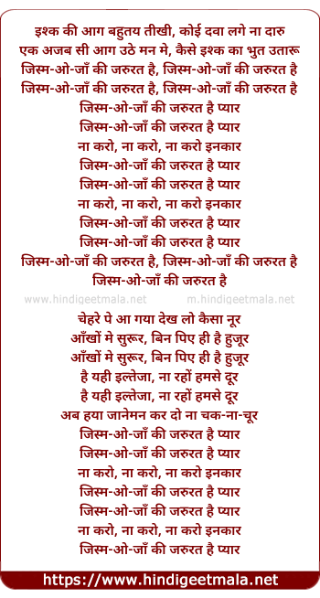 Lyrics of Jism Jaan Ki Jaroorat Hai - जिस्म जाँ की जरुरत है