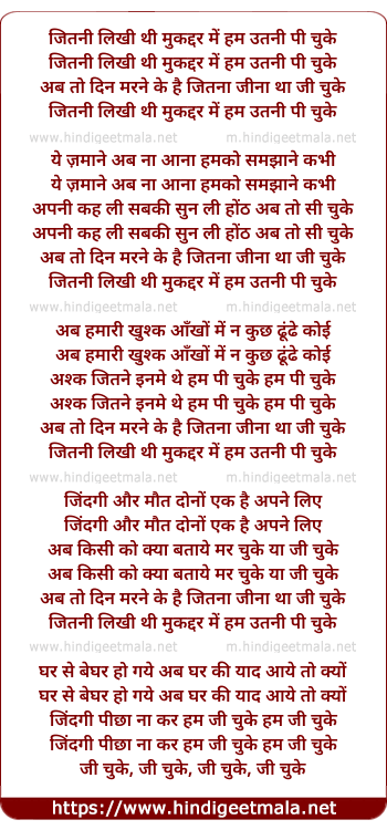 Lyrics of Jitni Likhi Thi Muqaddar Me Hum Utni Pi Chuke - जितनी लिखी थी मुकद्दर में हम उतनी पी चुके