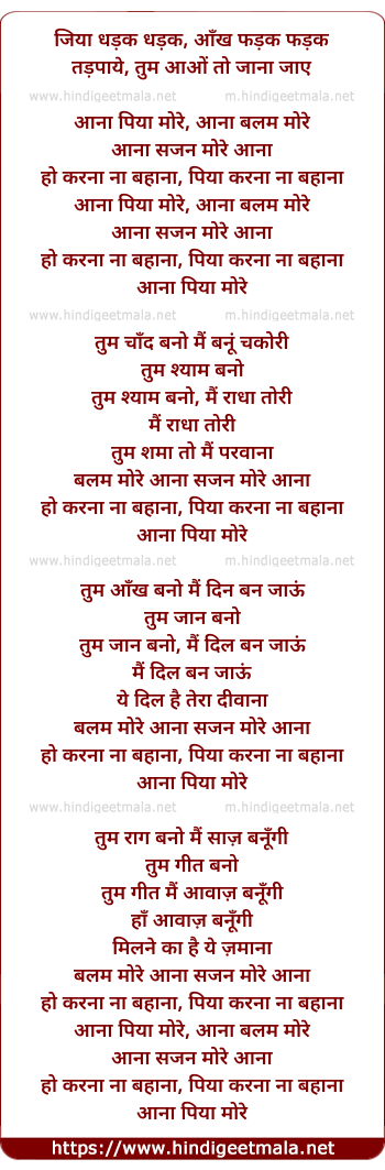 Lyrics of Jiya Dhadak Dhadak Aana Balam More Aana - जिया धड़क धड़क, आना बलम मोरे आना