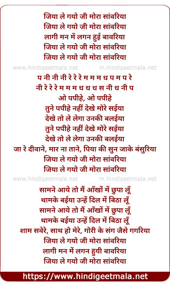 Lyrics of Jiya Le Gayo Ji Mora Sanwariya - जिया ले गयो जी मोरा सांवरिया