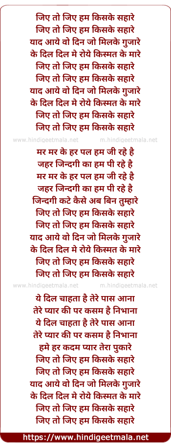 Lyrics of Jiye To Jiye Hum Kiske Sahare - जिए तो जिए हम किसके सहारे