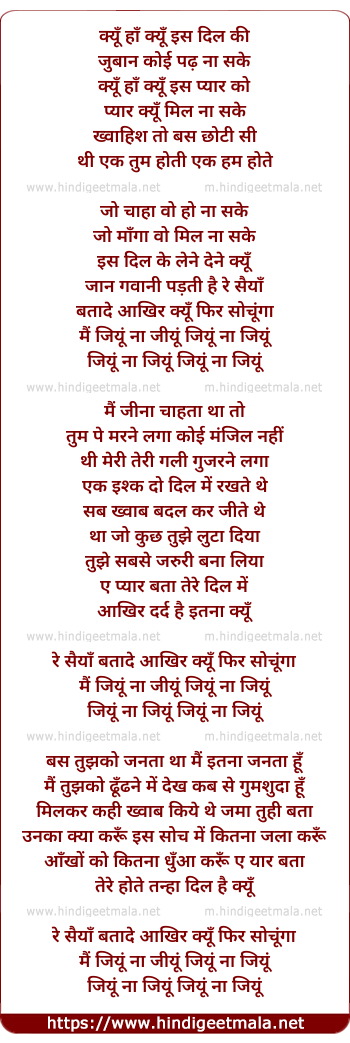 Lyrics of Jiyoon Naa Jiyoon - जियूं ना जियूं
