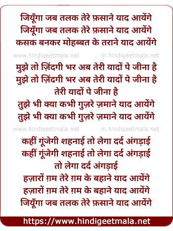 Lyrics of Jiunga Jab Talak Tere Fasaane Yaad Aayenge - जीऊंगा जब तलक तेरे फ़साने याद आयेंगे