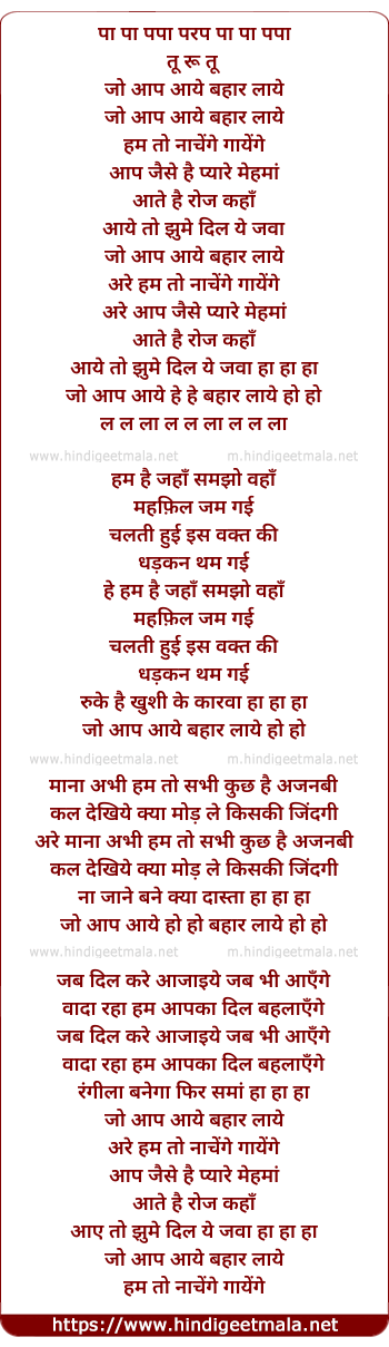 Lyrics of Jo Aap Aaye Bahar Laye - जो आप आये बहार लाये