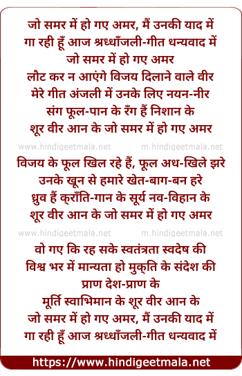 Lyrics of Jo Samar Me Ho Gaye Amar - जो समर में हो गए अमर