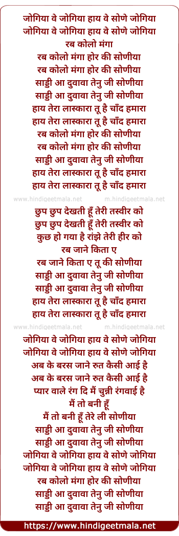 Lyrics of Jogiya Ve Jogiya, Rab Kolo Manga Hor Ki Soniya - जोगिया वे जोगिया, रब कोलो मंगा होर की सोणीया