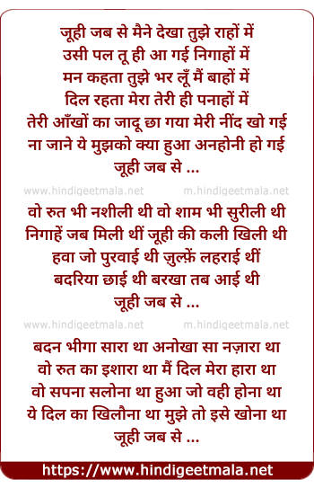 Lyrics of Juhi Jabase Mainne Dekhaa Tujhe Raahon Men - जूही जब से मैने देखा तुझे राहों में