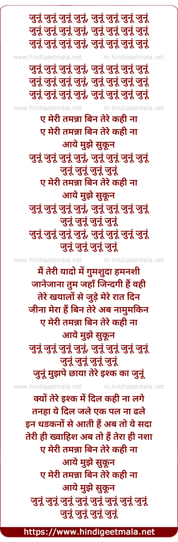 Lyrics of Junun... Aye Meree Tamanna Bin Tere Kahee Naa - जुनूं जुनूं जुनूं जुनूं, जुनूं जुनूं जुनूं जुनूं