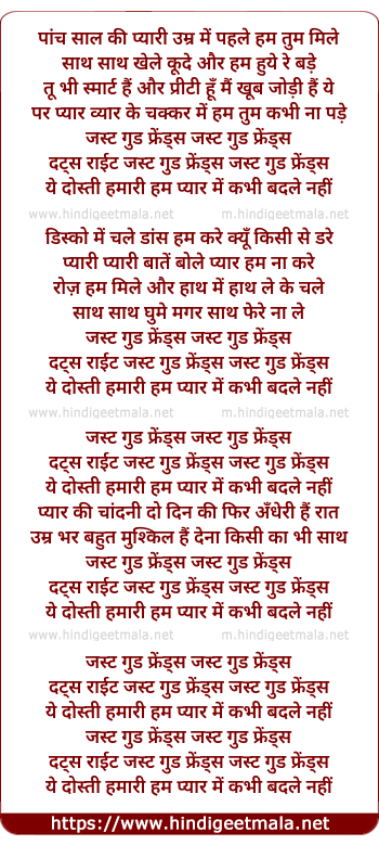 Lyrics of Just Gud Friends - पांच साल की प्यारी उम्र में पहले हम तुम मिले