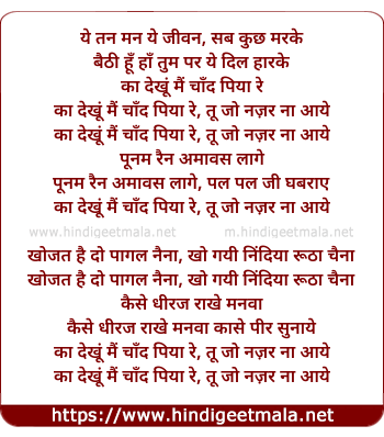 Lyrics of Ka Dekhu Main Chand - I - ये तन मन ये जीवन, सब कुछ मरके