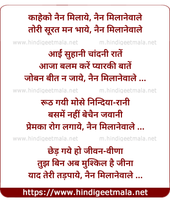 Lyrics of Kaaheko Nain Milaaye Nain Milaanewaale - काहेको नैन मिलाये, नैन मिलानेवाले