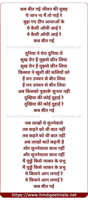 Lyrics of Kab Beet Gayi Jivan Ki Subah - कब बीत गई जीवन की सुबह