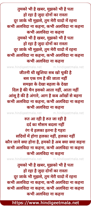 Lyrics of Kabhi Alvida Na Kahna - कभी अलविदा ना कहना