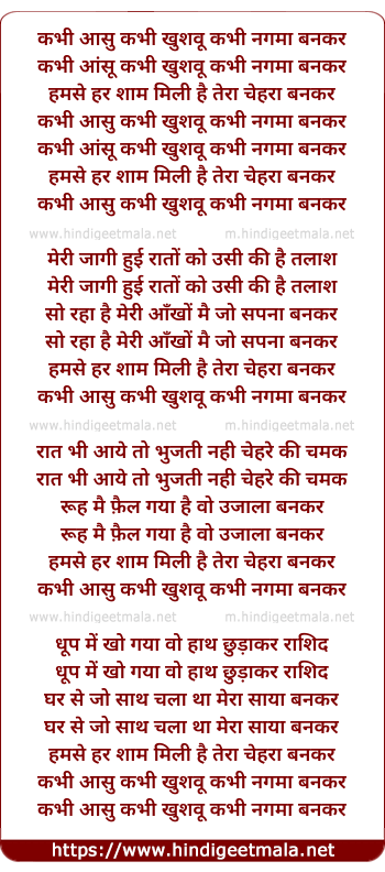 Lyrics of Kabhi Aansoo Kabhi Khusboo Kabhi Nagma (Duet) - कभी आसु कभी खुशवू कभी नगमा (डू एट)