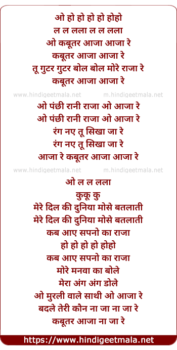 Lyrics of Kabutar Aa Ja Re - कबूतर आ जा रे