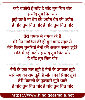Lyrics of Kahe Chakori Hey Chand Tum Chitchor - कहे चकोरी हे चाँद हे चाँद तुम चित चोर