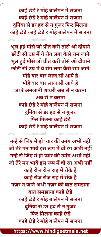 Lyrics of Kahe Chede Re Mohe Balepan Me Sajna - काहे छेड़े रे मोहे बालेपन में सजना