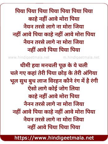 Lyrics of Kahe Naahi Aave Mora Piya - काहे नहीं आवे मोरा पिया