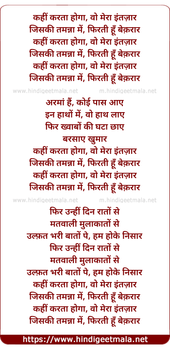 Lyrics of Kahee Karta Hoga Woh Meraa Intejar - कहीं करता होगा, वो मेरा इंतज़ार