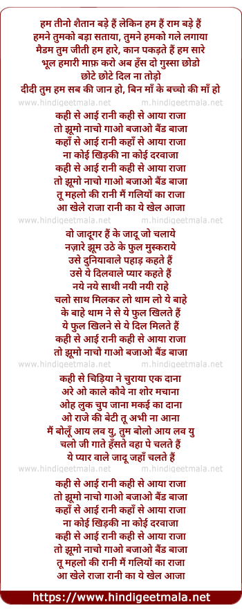 Lyrics of Kahi Se Aayi Rani Kahi Se Aaya Raja - कही से आई रानी कही से आया राजा