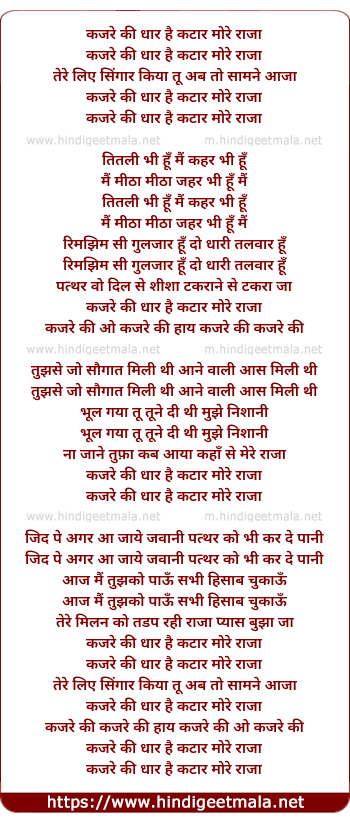 Lyrics of Kajre Ki Dhar Hai Katar More Raja - कजरे की धार है कटार मोरे राजा